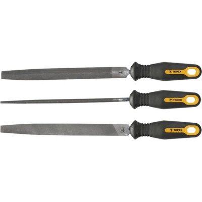 Kovové pilníky, 200 mm, odstupňování 2, sada 3, Ocel T12, průřez: plochý, půlkulatý, kulatý, rukojeť ze dvou materiálů Pilníky na kov TOPEX určené na broušení kovu. Univerzální...