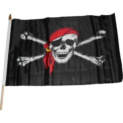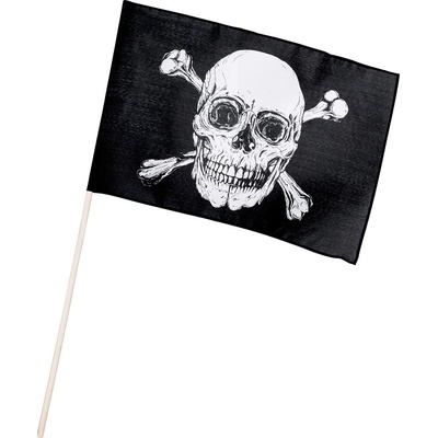 Nic nekřičí piráti tak, jako vlajka s lebkou a zkříenými hnáty. Zuřivý škleb a páska přes oko jsou jen třešničkou na dortu. Rozměry:30x45 cm Délka tyčky: 55cm