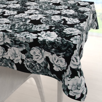 Dekorační čtvercový ubrus na jídelní stůl, vyrobený z hebké a příjemné sametové látky Tamara s digitálním tiskem, se vzorem černo-bílých pivoněk na černém podkladu. Látka Tamara...
