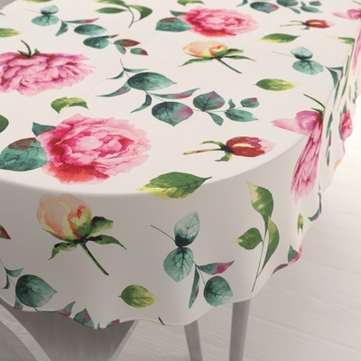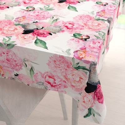 Dekorační obdélníkový ubrus na jídelní stůl, vyrobený z hebké a příjemné sametové látky Tamara s digitálním tiskem, se vzorem růžových pivoněk na bílém podkladu. Látka Tamara je...