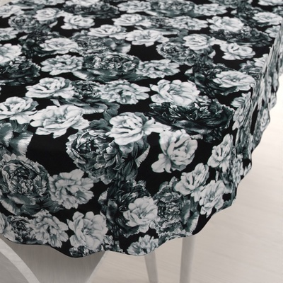Dekorační oválný ubrus na jídelní stůl, vyrobený z hebké a příjemné sametové látky Tamara s digitálním tiskem, se vzorem černo-bílých pivoněk na černém podkladu. Látka Tamara je...