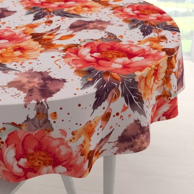 Bavlněný kulatý dekorační ubrus na stůl se vzorem velkých červeno-růžovo-oranžových květů pivoňky na bílém podkladu. Je ušitý z hustě tkaného 100% bavlněného plátna s...