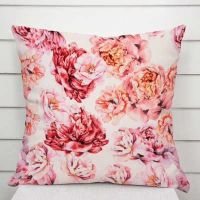 Dekorační povlak na polštář, vyrobený z hebké a příjemné sametové látky Tamara s digitálním tiskem, se vzorem růžovo-červených pivoněk na bílém podkladu. Povlak je ušit ze...