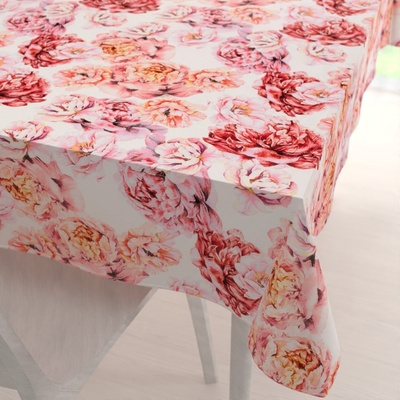 Dekorační obdélníkový ubrus na jídelní stůl, vyrobený z hebké a příjemné sametové látky Tamara s digitálním tiskem, se vzorem růžovo-červených pivoněk na bílém podkladu. Látka...