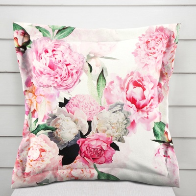 Dekorační povlak na polštář s ozdobným lemem, vyrobený z hebké a příjemné sametové látky Tamara s digitálním tiskem, se vzorem růžových pivoněk na bílém podkladu. Povlak je ušit...