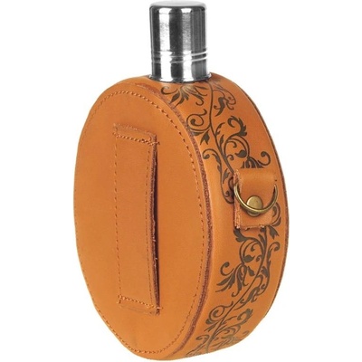Placatka v kůži kulatá výška: 14 cmtloušťka: 4 cmprůměr: 11 cmobjem: cca 2,5 dclmateriál: nerez, eko kůže Placatka na alkohol Popis: Kulatá nerezová placatka o objemu cca 2,5...
