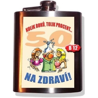Nerezová placatice pro muže k 50 výročí narození. " Dáš si dva, tři chlapské loky, budeš hrdý na své roky".