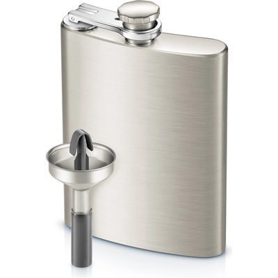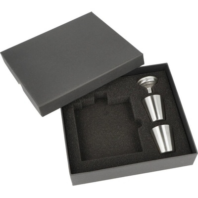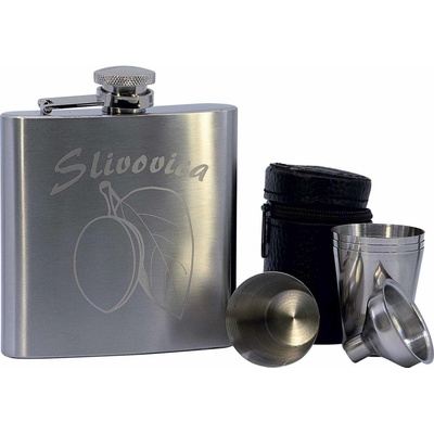 Sedmidílná sada obsahující kapesní nerezovou lahev (objem cca 210 ml), trychtýř a čtyři malé kalíšky v ochranném pouzdře. Materiál nerezová ocel 304, PU kůže.