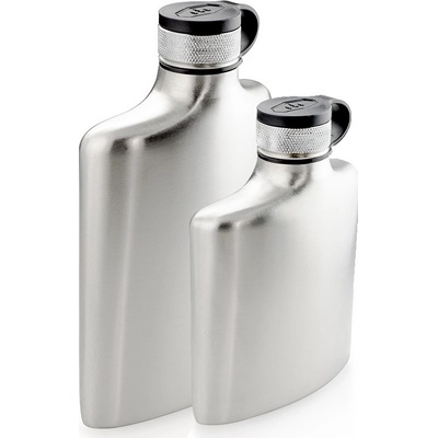 Placatka z nerezové oceli. Láhev má šroubovací uzávěr s vnitřním závitem.