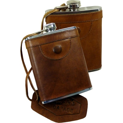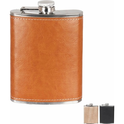 Placatka z nerezové oceli 8 02 s obalem z hovězí kůže. Láhev má masivní šroubovací uzávěr s vnitřním závitem. Uzávěr je spojen s láhví. Láhev je mírně zaoblená, aby přesně...
