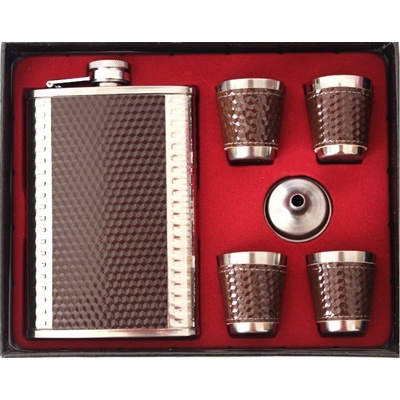 Dárkový set nerezové placatice o objemu 270 ml s hnědou koženkou. Hnědá koženka s 3D vzorem je potažená na čele i vzadu. Po stranách lze vidět krásně lesklou nerezovou...