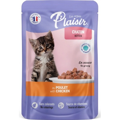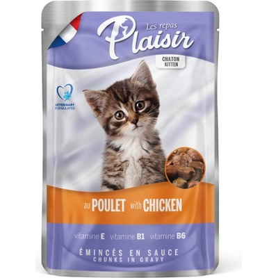 Kapsička Plaisir Kitten s kuřecím masem je kompletním krmivem pro koťata. Složení: maso a výrobky živočišného původu 44%, kuřecí maso 4%, deriváty rostlinného původu, výtažky bílkovin z rostlin, minerální látky, cukry. Nutriční hodnoty: Hrubý protein 9.5%, Hrubá...