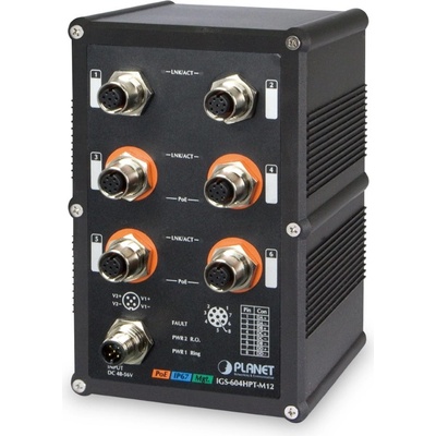 PLANET IGS-604HPT-M12; Vodotěsný průmyslový spravovatelný přepínač a konvertor s PoE, 6 portů 1000Base-T z toho 4x PoE injektory s celkovým výkonem 140W, konektory M12. Web/SNMPv3 správa, scheduler. L3 statické r... PLANET IGS-604HPT-M12 Vodotěsný průmyslový...