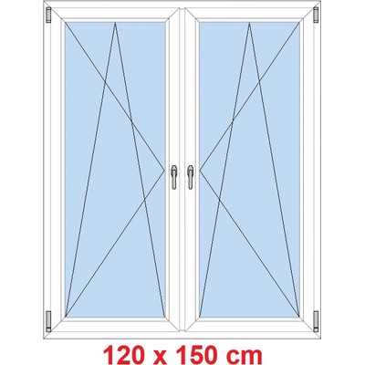 Plastové okno dvoukřídlé bez středového sloupku (se štulpem) o venkovním rozměru rámu okna 120x150 cm v bílé barvě z interiéru i z exteriéru. Hlavní křídlo (vpravo) je otevíravé...