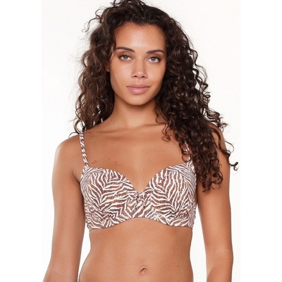 Dámské plavky LingaDore horní díl. Podprsenka klasického střihu se zebřím vzorem v hnědo-tělové barvě má vyztužené košíčky s kosticemi a nižší střed. Mezi košíčky je ozdobná...