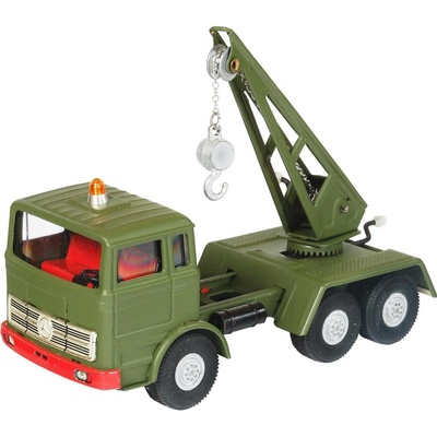 Model dle skutečného vozu z potištěného plechu. Model je vybaven otočným jeřábem a mechanizmem pro zvedání břemene. Pozici háku lze zajistit v požadované poloze. Vyrobeno z...