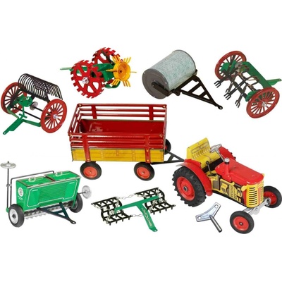 Pohyb traktůrku zajišťuje unikátní pérový strojek natahovaný klíčkem. Převodovka má 3 rychlosti dopředu, neutrál a zpátečku. Traktor lze volantem skutečně řídit a navíc ho i...