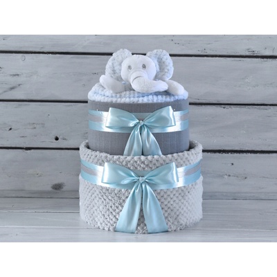 Náplň tohoto dvoupatrového plenkového dortu tvoří: šedá fleecová deka (rozměr 75x90 nebo 75x100 cm) 2 KIKKO tetra pleny dětské body (bavlna) ponožky přebalovací...