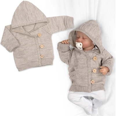 \nElegantní hnědý kojenecký svetřík s moderní kapucí s ušima.\nZapínání na dřevěné knoflíčky.\nMateriál:100% Akryl. \nDetailní rozměry:\nVel. 56 - délka 24 cm, hrudník 2 x 22cm, rukáv od krku 23 cm.\n