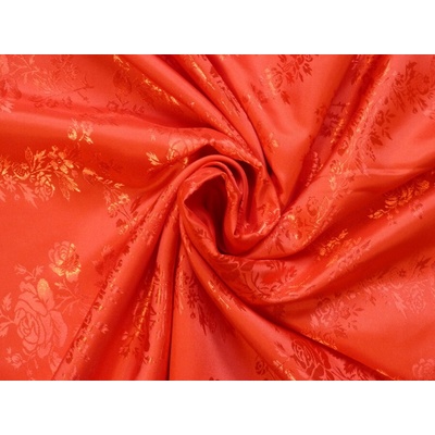 Tato červená žakárová podšívka (směs acetát viskoza) má vyšívaný stromečkový vzor. Je vhodná na podšití šatů, sak, tunik, nebo sukní.