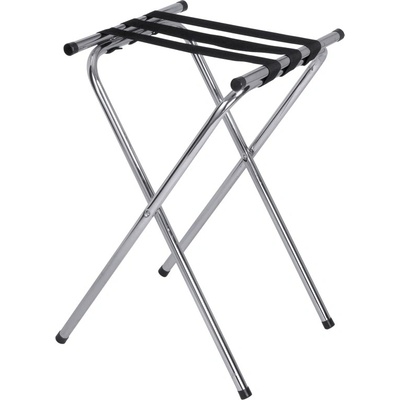 Skládací stojan na kufry je vyrobený z chromované oceli a nylonových pásů o průměru 50 mm. Rozměry po složení 490x70x900 mm.