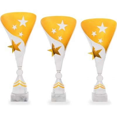 379-183. Plastové poháry na mramorovém podstavci. Velikost pohárů je uvedena za lomítkem katalogového čísla. Při nákupu celé sady (47cm-zlatý/45cm-stříbrný/42cm-bronzový), text...