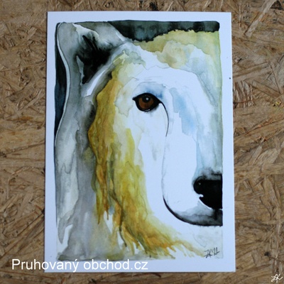 Medvěd lední. Jedna. Z trojice půlšelem. Akvarel. Pohlednice. Tištěno digitální technologií v tiskárně, pohlednicový karton, gramáž papíru 300g/m2, barva papíru: matná lomená...