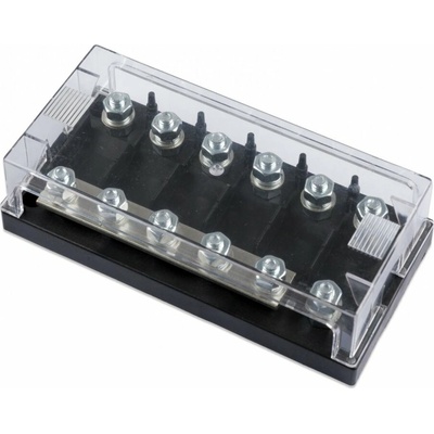Držák pro 6ks MEGA pojistek s průhledným krytem a busbarem 250A 70V Materiál: pokovená měď, pokovené želené šrouby PARAMETRY:Maximální proud: 250 AMaximální napětí: 70...