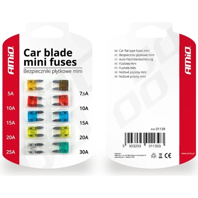 Kvalitní sada pojistek MINI pro ochranu elektrických instalací vozidla před poškozením. Obsah balení 1x5A, 1x7,5A, 2x10A, 2x15A, 2x20A, 1x25A, 1x30A. Počet kusů v balení je 10 ks.