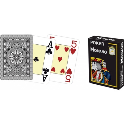 Kvalitní pokerové karty ze 100% plastu oblíbené značky Modiano. Karty mají klasický širokoúhlý formát, jsou 8,89 cm vysoké a 6,35 cm široké. Karty jsou čtyřrohé - tedy v každém...