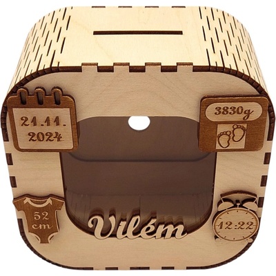 Hledáte jedinečný a osobní dárek k narození dítěte? Naše dřevěná pokladnička je nejen krásnou dekorací, ale i praktickým doplňkem, který pomůže dítěti učit se spořit. Přední...