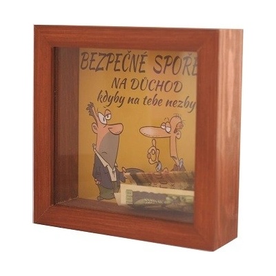 Dřevěná pokladnička na důchod, krásný obrázek s vtipným textem: "Bezpečné spoření na důchod, kdyby na tebe nezbyl". Vtipný dárek nejen k narozeninám, ale i k odchodu do...