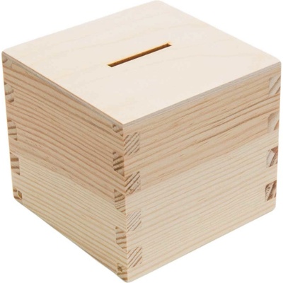 Pokladnička k dodání do 3 dnů. Velikost výrobku je 9x9x8,5cm. Spodní otvor pro výběr.