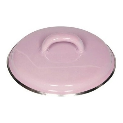 Smaltovaná poklice s chromovým okrajem pasuje na hrnec stejné růžové barvy.