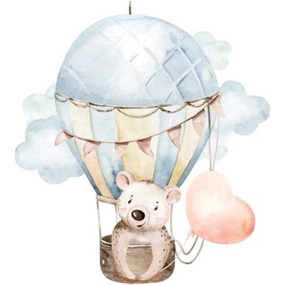 Dětský plakát 'Medvídek v balónu' z kategorie obrázky pro děti zobrazuje medvídka dobrodruha v létajícím balónu. Plakát je kreslený, ve stylu akvarelových barev. Dětské obrázky...