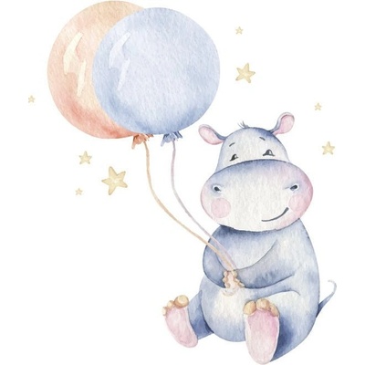 Dětský plakát 'Hrošík s balónky' z kategorie obrázky pro děti zobrazuje malého hrošíka s barevnými balónky. Tento veselý plakát je kreslený ve stylu akvarelových barev. Dětské...