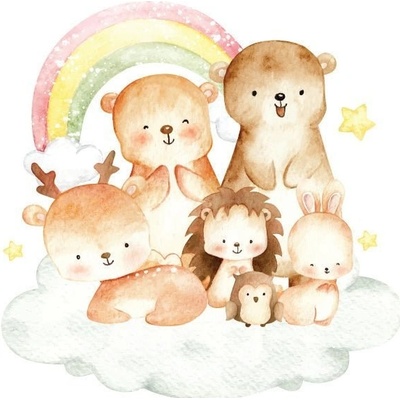 Dětský plakát 'Duhová zoo' z kategorie obrázky pro děti zobrazuje partu lesních zvířátek na obláčku s duhou. Tento veselý plakát je kreslený ve stylu akvarelových barev. Dětské...