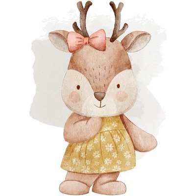Dětský plakát 'Slečna jelenka' z kategorie obrázky pro děti zobrazuje malou jelení holčičku v květovaných šatech a mašlí. Plakát je kreslený, ve stylu akvarelových barev. Dětské...