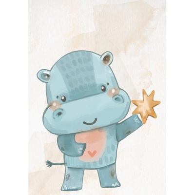 Dětský plakát 'Hrošík s hvězdičkou' z kategorie obrázky pro děti zobrazuje roztomilého hrošíka s hvězdičkou a srdíčkem na bříšku. Plakát je kreslený, ve stylu akvarelových...