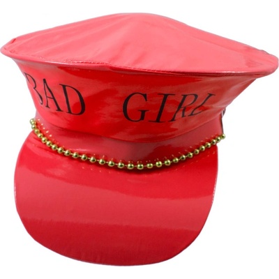 Párty čepice policejní v červené barvě s černým nápisem BAD GIRL a zlatým řetízkem, materiál polyester, šířka 27 cm, výška 5 cm, jednotná velikost.