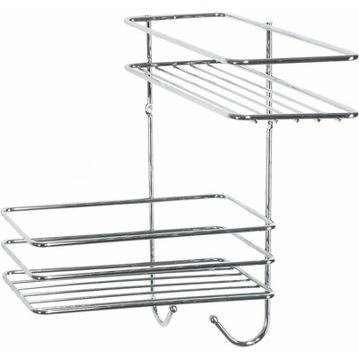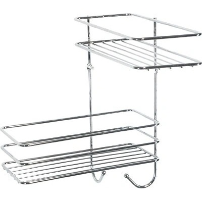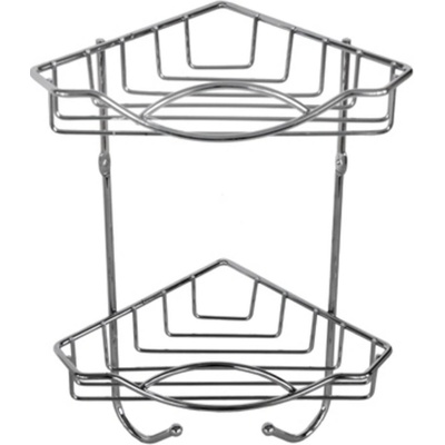 Kvalitní rohová dvoupatrová koupelnová polička vyrobená z chromovaného drátu.