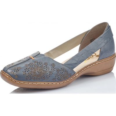 Dámské polobotky značky Rieker na pohodlném klínku s perforovaným vzorem. Modrý vzor s prošíváním dává botám šmrnc. Díky klínku a vyměkčeným stélkám jsou pohodlné při chůzi....