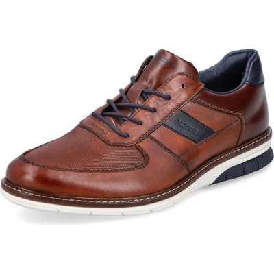 Sportovně-elegantní teniska od značky RIEKER se svrškem vyrobeným převážně z přírodní usně v lesklém provedení. Zdobnými prvky jsou modré detaily, jemná perforace na špici a lemov