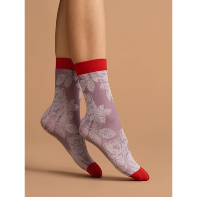 RED ROSE-vzorované ponožky 40den lila s červenou špicí pokračující v lila a červeným okrajem s bílými květy,vyrobené z příze typu elastan.Velikost univerzální,bez zesílené...