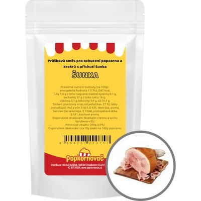Příchuť na popcorn a krekry Šunka (200g) Kořenící směs v prášku s příchutí "šunka" pro ochucení popcornu a krekrů na smažení. Jedno balení kořenící směsi vystačí až na 20...