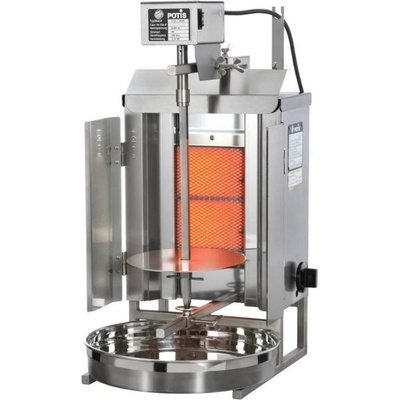 Plynový gril na gyros, model GD1/S od Německé firmy POTIS. Kapacita 7kg. Model GD1/S má pohon jehly umístěn nahoře a jsou osazeny tepelným krytem motoru. Posuv vzdálenosti motoru, jehly a naklánění jehly umožňuje lépe regulovat teplotu v jednotlivých úrovních tepelně...