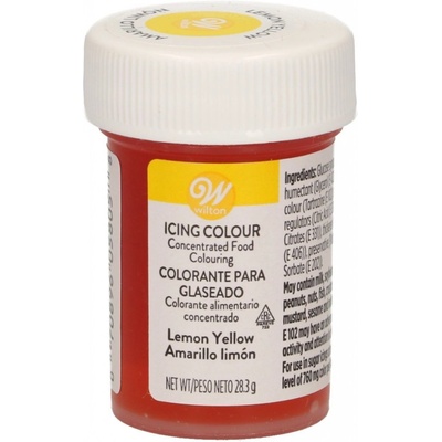 Gelová barva citronově žlutá lemon yellow Wilton. Složení: glukózový sirup, cukr, zvlhčující látka (glycerol (E422)), voda, barviva (E102), škrob, regulátor kyselosti...