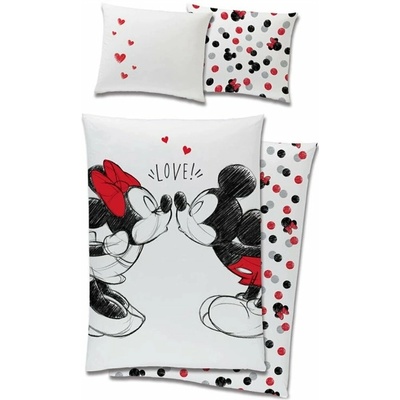 Ložní souprava Disney - Zamilovaní Minnie & Mickey Mouse. Toto oboustranné povlečení je vyrobeno ze 100% bavlny se zapínáním na zip. Lícní stranu povlečení na peřinu zdobí obrázek legendárních myšáků při polibku a nápis LOVE! Lícní strana polštáře je bílá s několika...