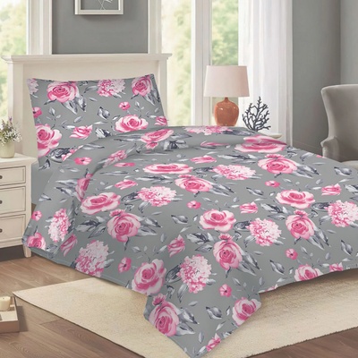 Bavlněné povlečení za dostupnou cenu se vzorem růžových růží na šedém podkladu. Povlak na přikrývku i povlak na polštář mají vzor z obou stran stejný. Souprava je vyrobena ze...