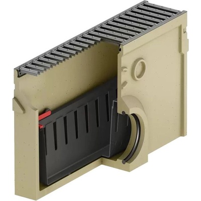 Žlabové těleso z polymerbetonu s optimalizovaným (zesíleným) tělem, volný přístup do žlabu pro snadné čištění, bezšroubová aretace roštu, dle EN 1433, pojízdný osobními...